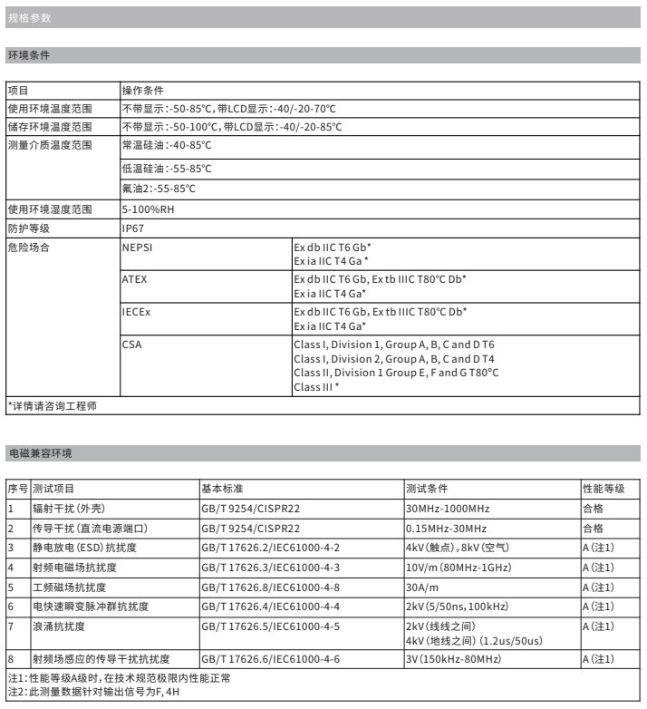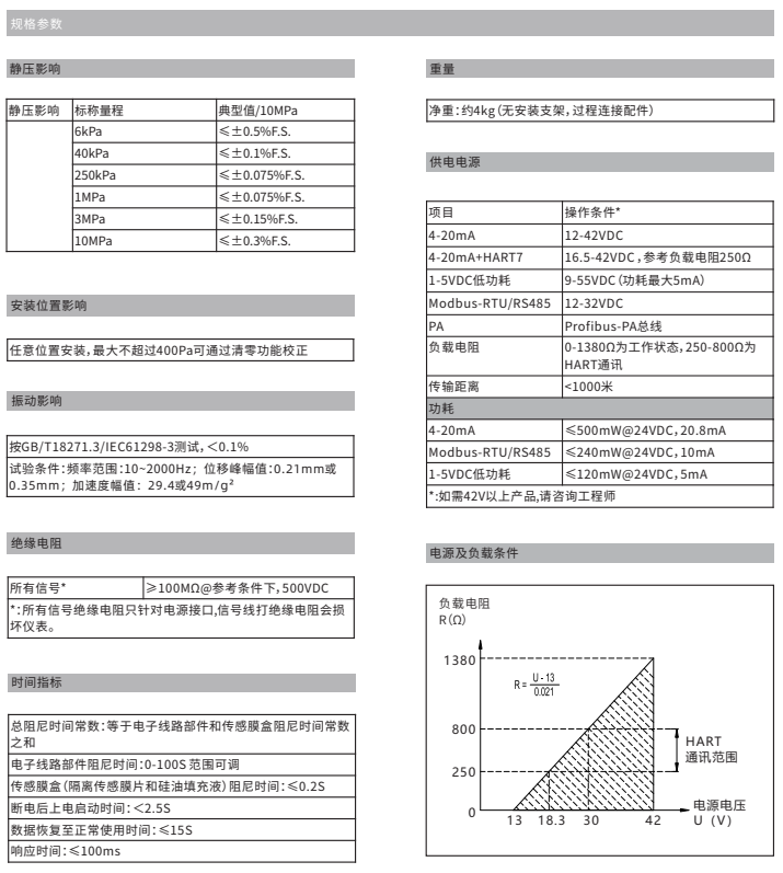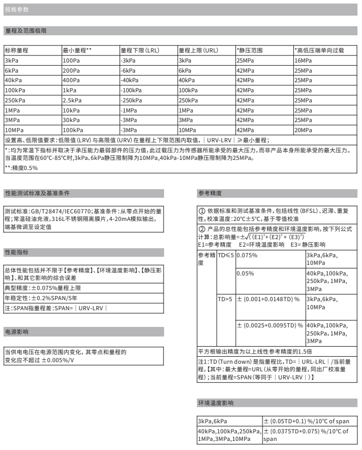 产品特点 • 采用单晶硅压阻技术,性能稳定,精度可 达 0.05%FS。 • 最高 100:1 量程比,测量范围调整灵活。 • 采用高性能 EMC 防护电路模块,有效降低 电磁扰动对产品的输出影响。 • 稳定性强可达 ±0.1%SPAN/5 年。